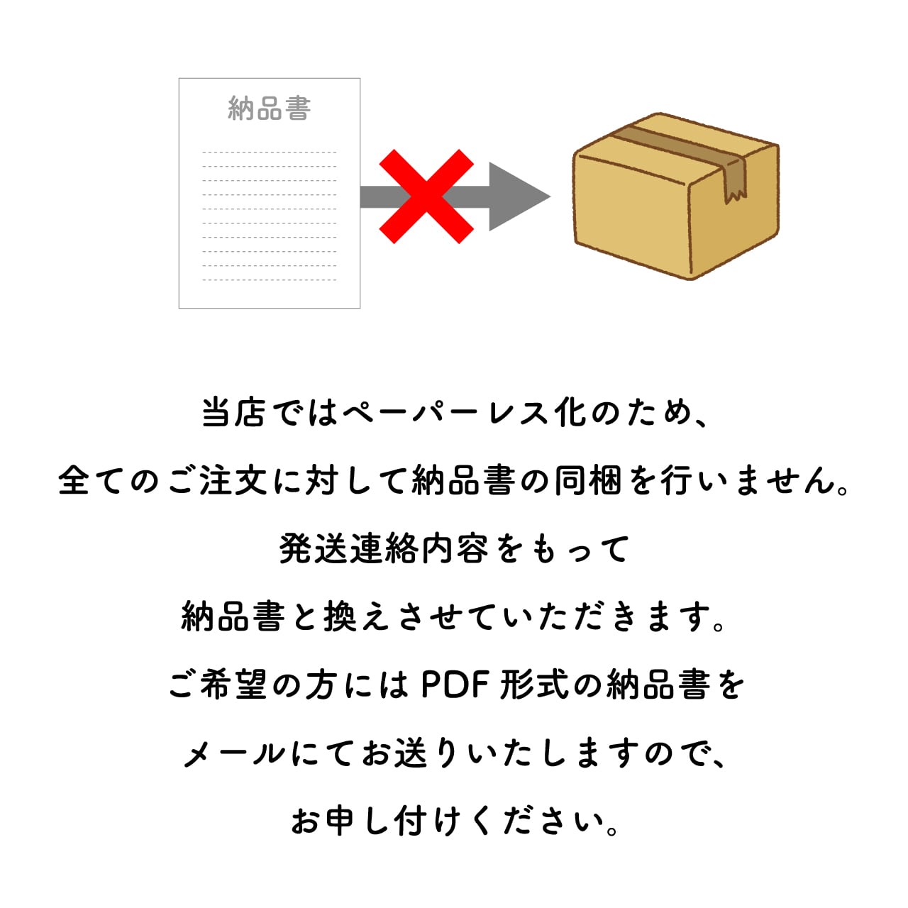 ご希望の方にはPDF形式での納品書をメールにてお送りいたしますので、お申し付けください。