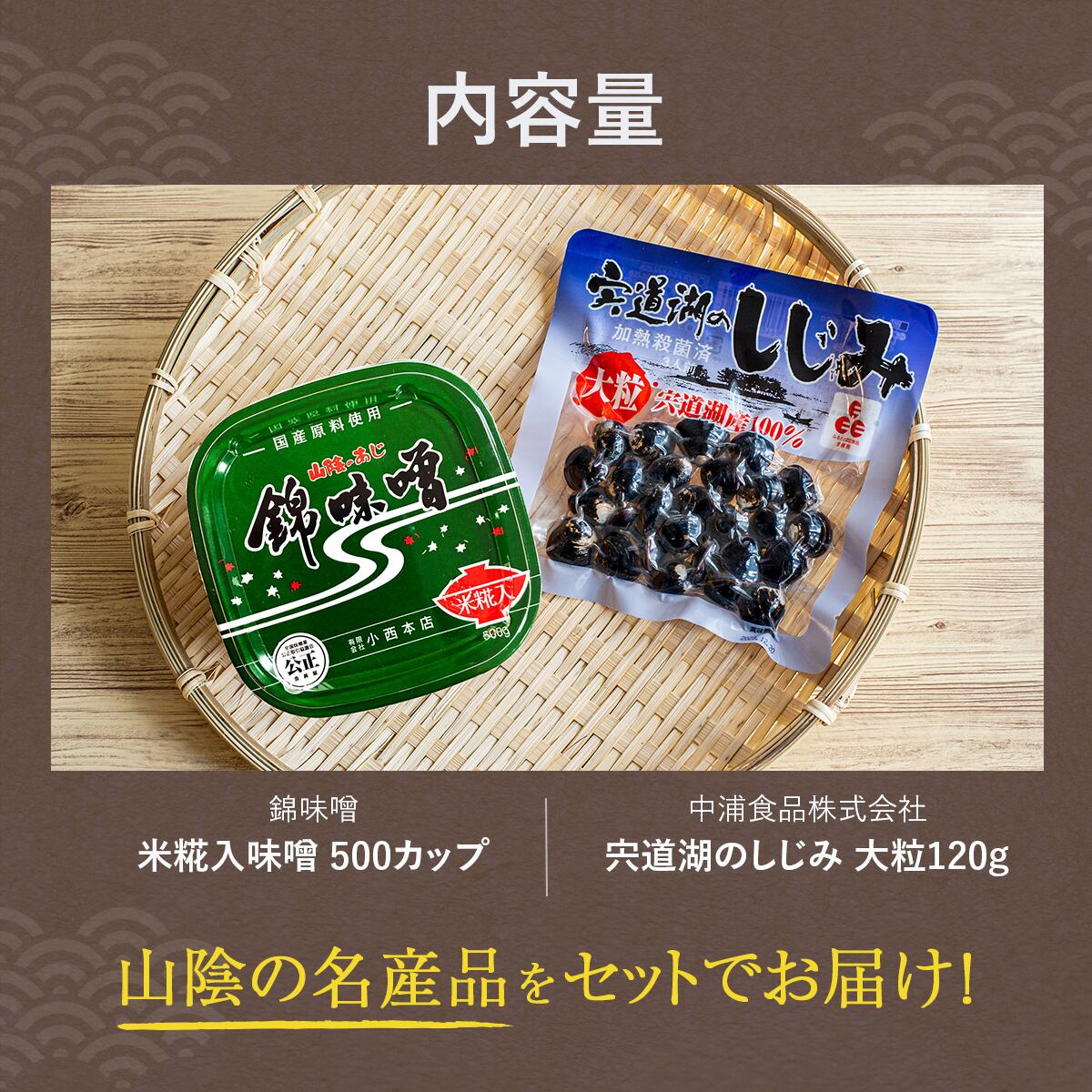 嘉永六年(1853年)創業・松江の老舗味噌蔵が作り続けてきた錦味噌 米糀入(500g)に宍道湖産大粒しじみ(120g/3人前)をまとめてお届け!しじみ味噌汁セットです。